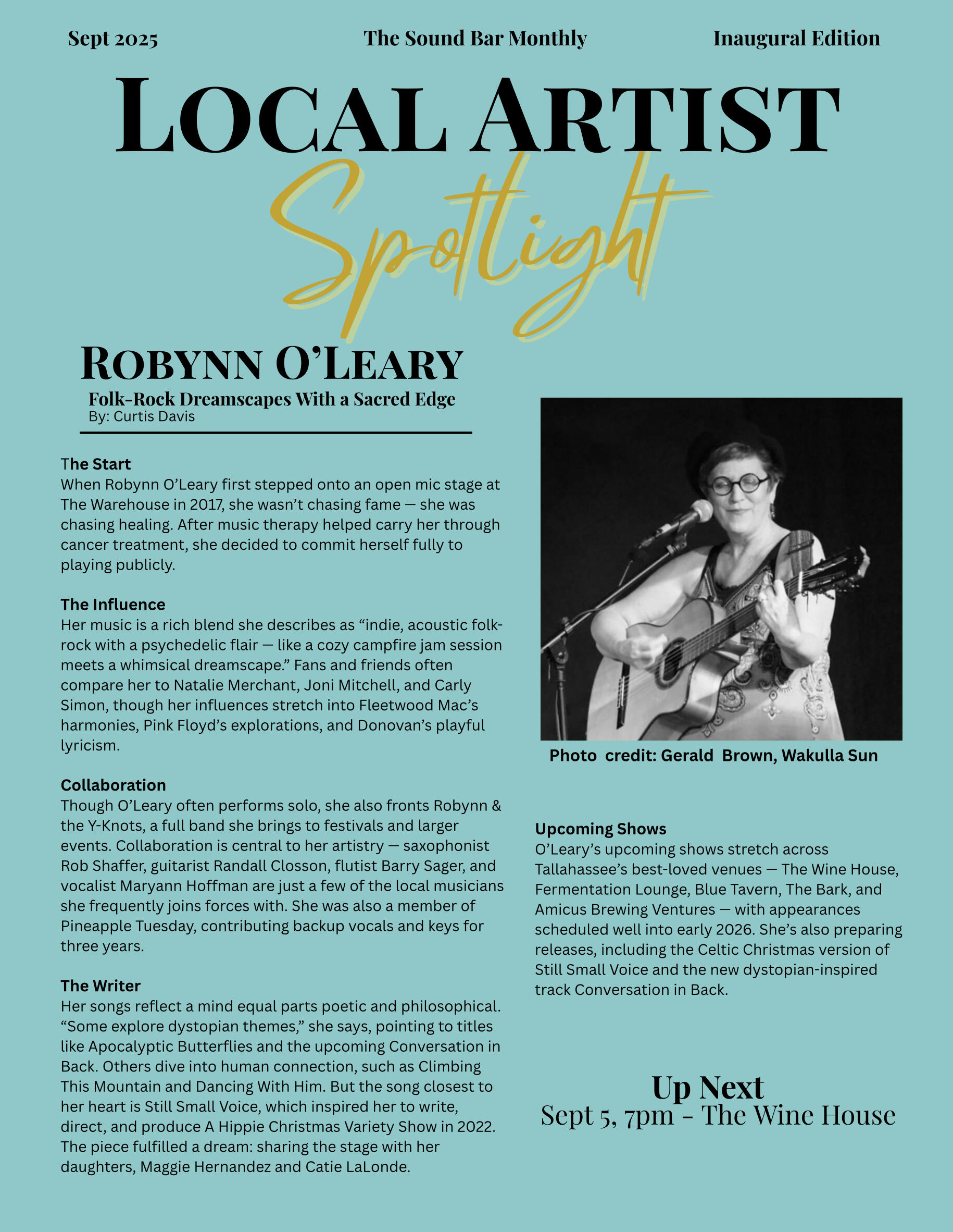Robynn, a folk-psychedelic solo artist, captivates with soulful vocals, and acoustic guitar. Collaborating with musicians like Rob Shaffer (saxophone), Randall Closson (guitar), and Maryann Hoffman (vocals/percussion), she blends folk, art rock, and gypsy vibes. As “Robynn & the Y-knots,” she fronts a full band for festivals and fundraisers. Robynn performs at cozy spots like The Blue Tavern, La Florida Coffee & Wine, Rae’s Restaurant, and stages like the Sound Bar, The Getaway Grill and Palaver Tree Theater. Her original song, Apocalyptic Butterflies, weaves poetic storytelling, with her upcoming release, Conversation in Back, exploring dystopian themes.